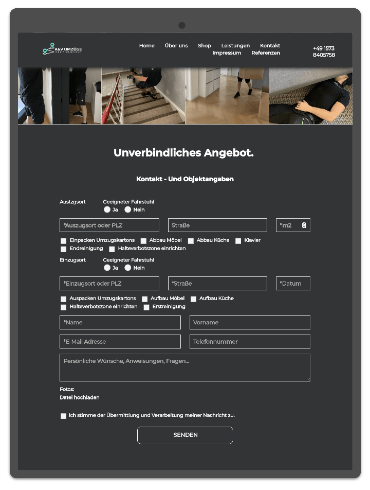 Nutzen Sie unsere Kontakt-Formulare, senden Sie uns Fotos, beschreiben Sie was transportiert werden soll. Eine kostenlose Besichtigung und Beratung vor Ort oder per Videoanruf ist ebenfalls jederzeit möglich.